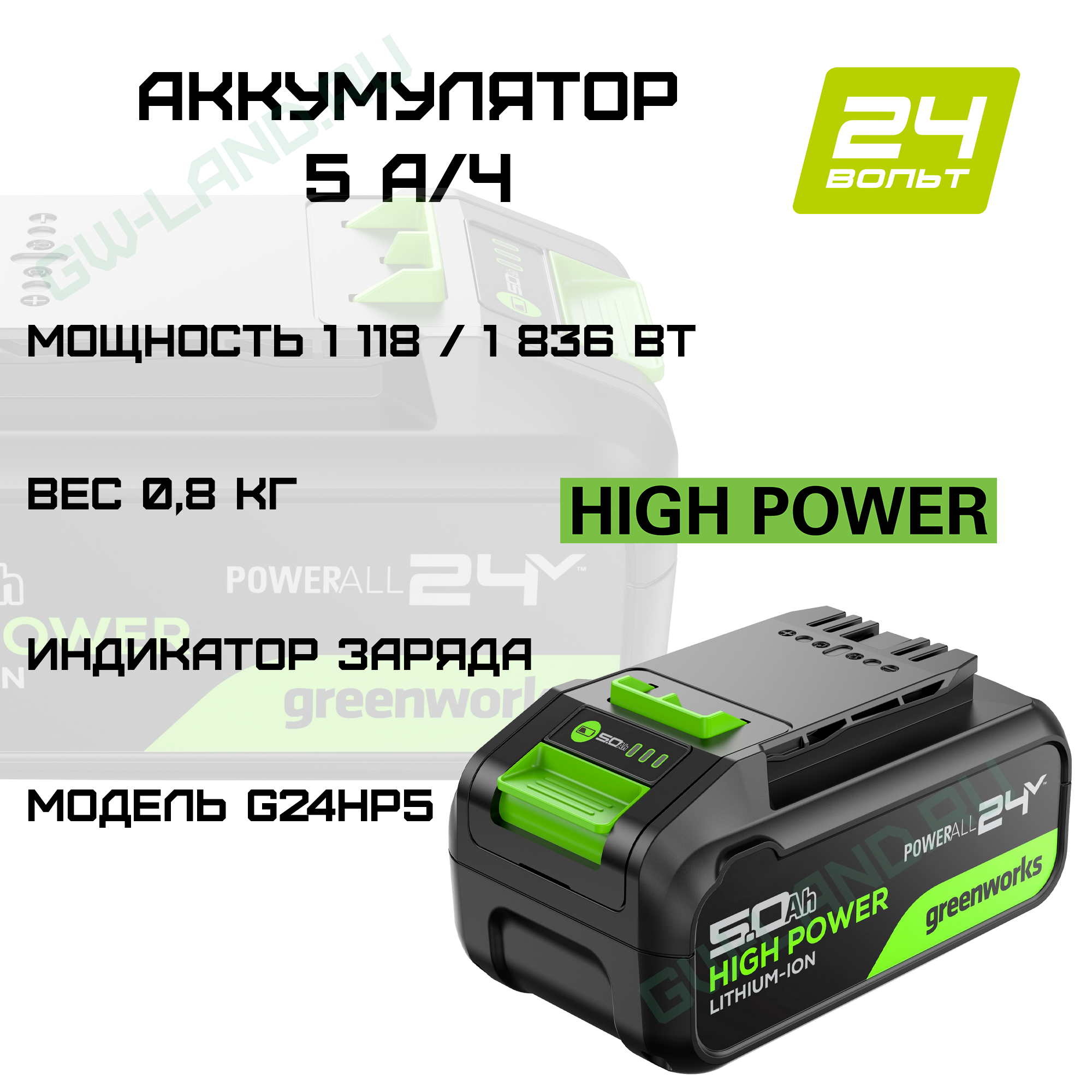Аккумулятор Greenworks High Power G24HP5 – это новая модель на платформе 24V, которая подходит ко всем инструментам линейки POWERALL. Его емкости в 5 А·ч хватит надолго благодаря отсутствию "эффекта памяти" у встроенных Li-ion ячеек формата 18650. Современная защита от перегрузки, перегрева и слишком сильного разряда продлевают время жизни этой мощной батарейки. К тому же она быстро заряжается: всего 160 минут понадобится для полной зарядки через устройство на 2 ампера, а если использовать зарядник помощнее (4 ампера), то весь процесс займет около 95 минут! Управляется всё умными технологиями Greenworks, что гарантирует высокую эффективность работы любого подключенного к нему девайса. Плюс есть специальный дисплей спереди, который показывает оставшийся уровень энергии — удобно следить за состоянием во время использования!