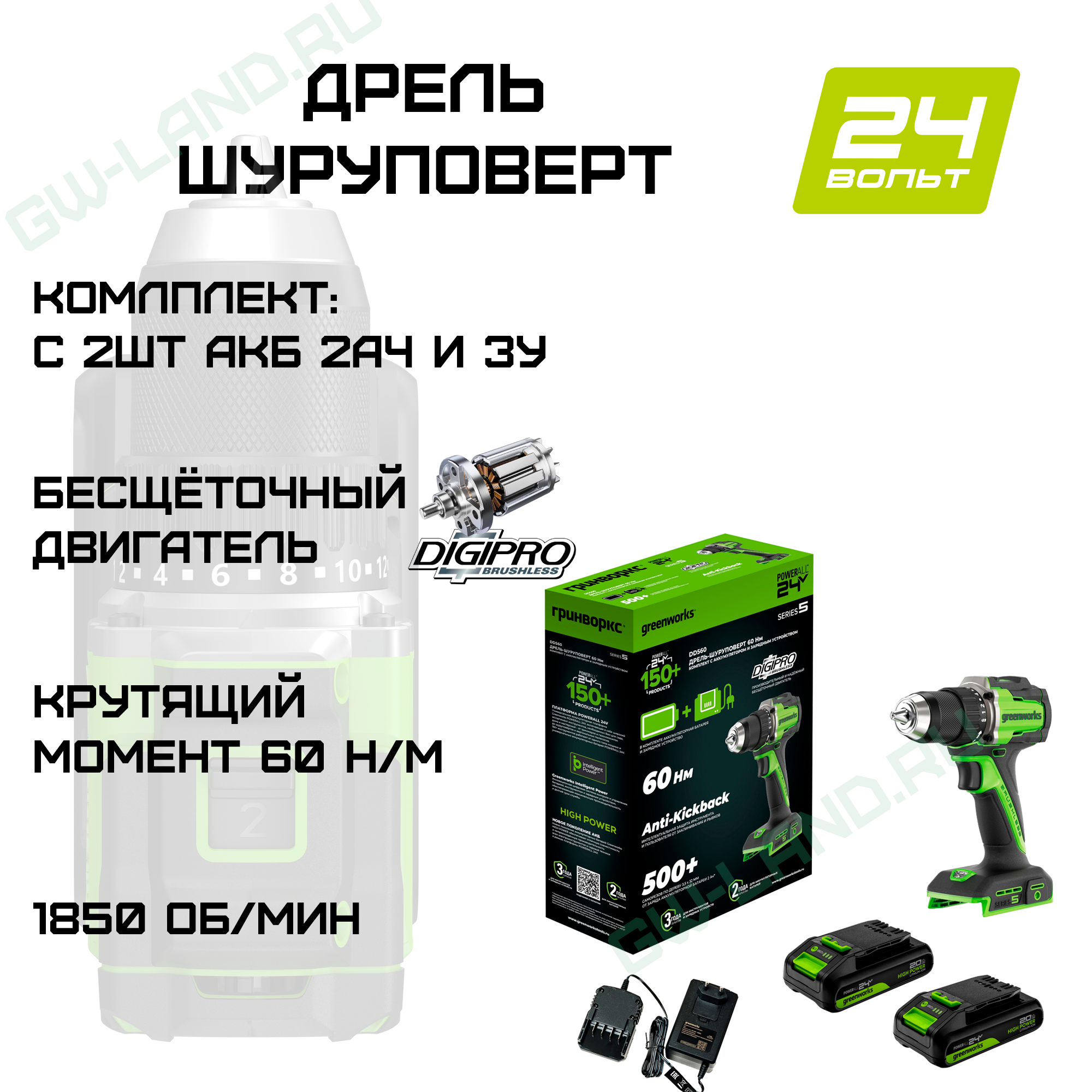 Дрель-шуруповерт Greenworks DD560 24V 3708407CUC (30/60 Нм) бесщеточная аккумуляторная с двумя 2 Ач аккумуляторами и зарядным устройством – Лёгкость, мощность и комфорт работы - всё это дрель-шуруповёрт Greenworks DD560! С толщиной всего лишь 145 мм и весом меньше килограмма она легко помещается даже в небольшой сумке. Бесщёточный двигатель обеспечивает невероятную производительность от 30 до 60 Нм крутящего момента, превращая любую задачу в простую формальность. Функция защиты от отдачи гарантирует безопасное применение данного устройства. Дрель-шуруповёрт Greenworks DD560 – ваш идеальный помощник во время строительства или ремонта!