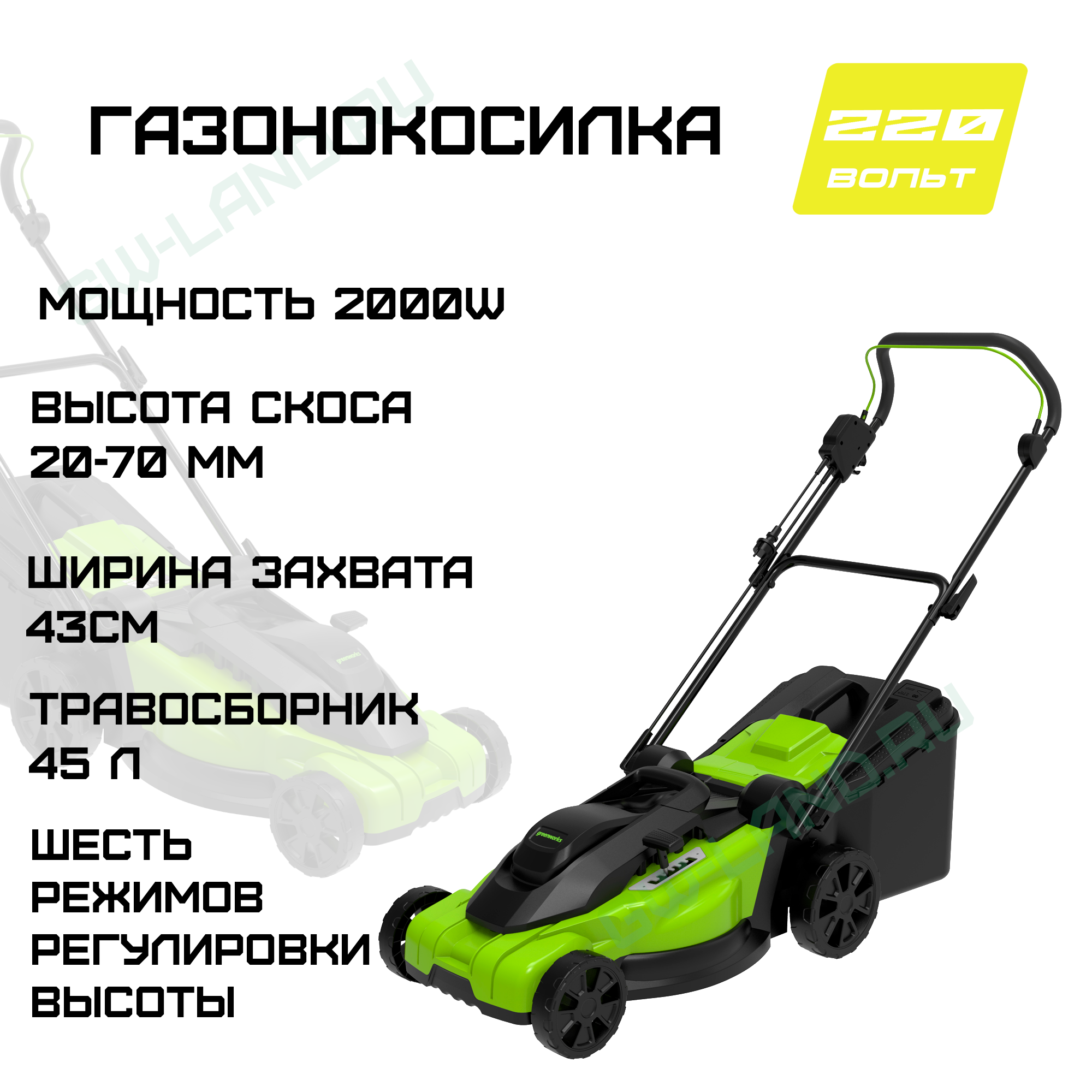 Электрическая газонокосилка Greenworks 2000W 43 см – флагманская модель серии Greenworks 230V/220в. Оснащена мощным двигателем 2 кВт и рабочей шириной 43 см, сравнима с бензиновыми аналогами.
