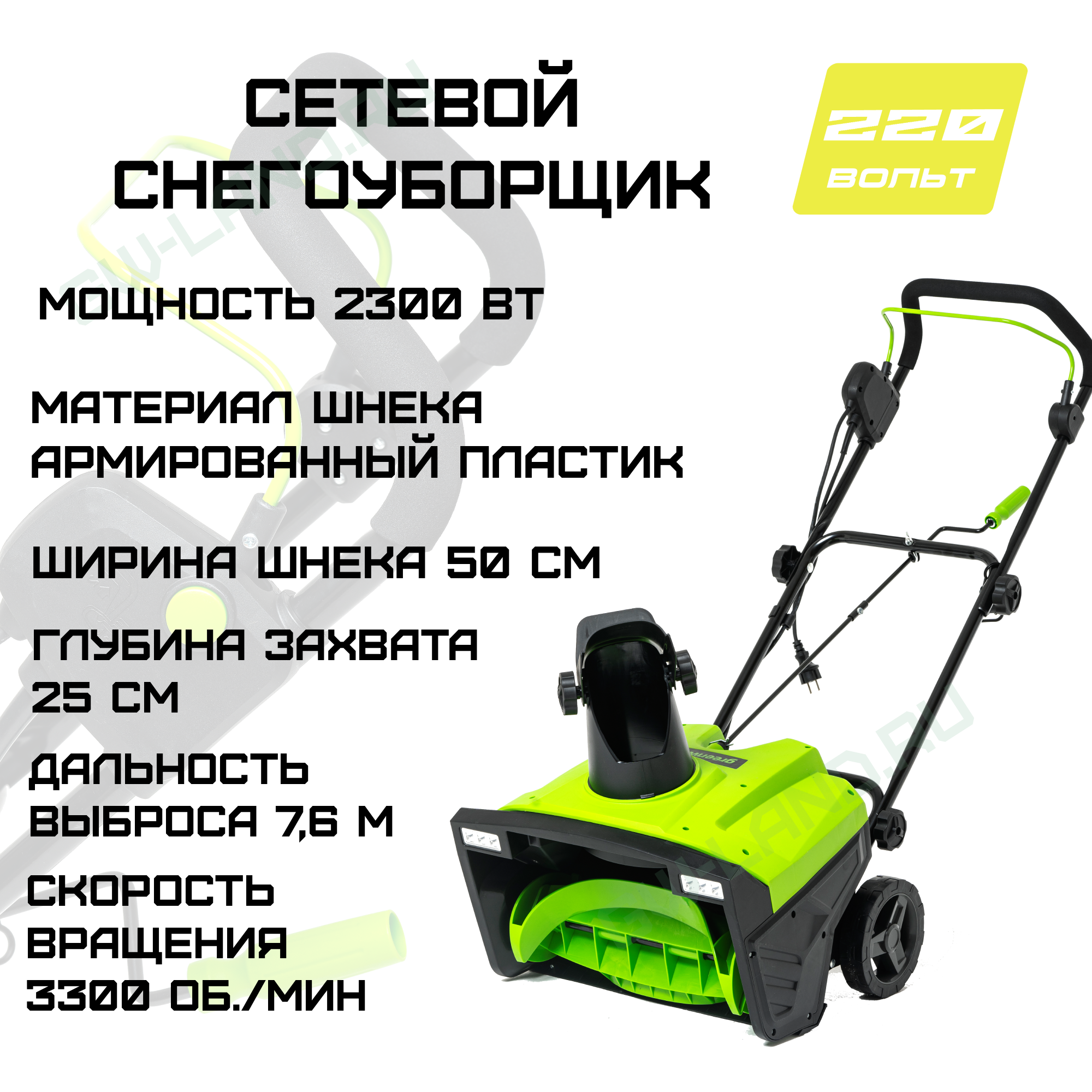 Электрический снегоуборщик 2602707 Greenworks SN2300 идеален для уборки снега на небольших территориях рядом с домом или гаражом, а также тротуарах. Он оснащён мотором мощностью 2300 Вт (3,1 л.с.), который обеспечивает эффективную работу даже со слежавшимся снегом. Ширина обрабатываемой полосы составляет 50 см – это удобно для быстрой чистки узких дорожек. Максимальная глубина захвата достигает 25 см, а дальность выброса снега можно отрегулировать вплоть до 7,6 метра прямо во время движения. Рычаг управления направлением находится под рукой у пользователя. Шнек у модели Greenworks SN2300 выполнен из стойкого к ударам пластика, бережно относится к деликатным поверхностям и эффективно убирает снег практически до самого основания. Для безопасной эксплуатации предусмотрена защита от случайного запуска. Благодаря складной рукоятке устройство легко хранить даже в небольшом помещении.