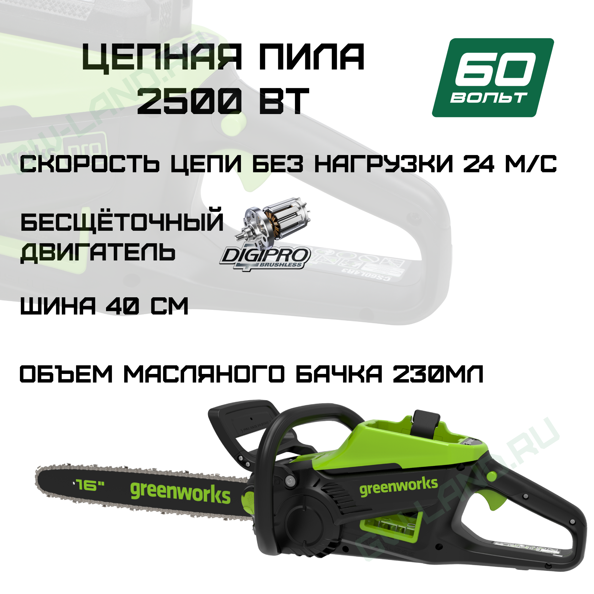 Цепная пила Greenworks GD60CS25 60V — это мощный бесщёточный помощник для работы как дома, так и на участке. Благодаря скорости цепи до 24 метров в секунду и длине шины 40,6 см она легко справляется с брусьями, брёвнами и даже может повалить дерево! Удобство эксплуатации обеспечивают малый вес, лёгкий запуск одной кнопкой и автоматическая смазка цепи. Безопасность гарантируют защитный механизм против случайного пуска и надёжная остановка цепи.
